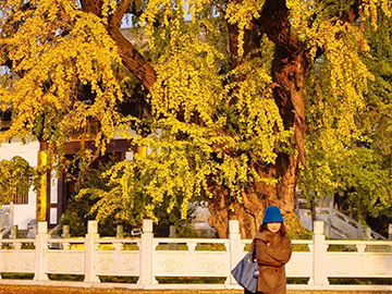 古刹・惠済寺のイチョウは現在わずかに黄葉し始めており、枝先は緑から金色へと移り変わっています。まるで最後の力を蓄えながら、盛大な黄金の開花を待っているかのようです。例年の見頃は11月下旬から12月中旬にかけてで、まさにこれから最も輝く時期を迎えます。