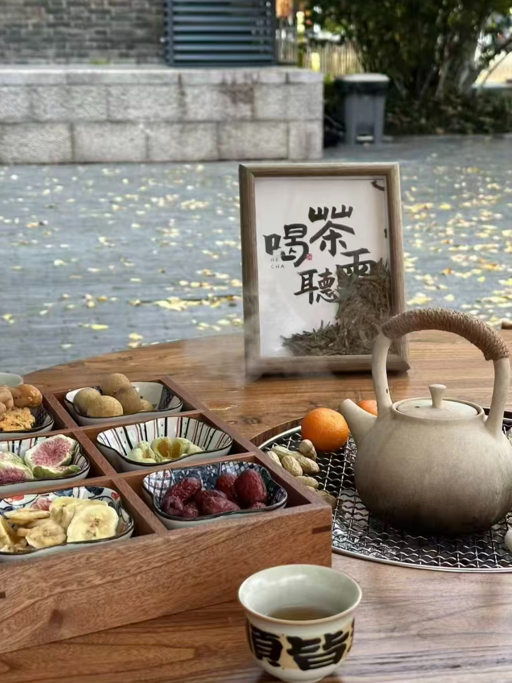 温かいお茶を手に、窓越しに金色の葉が静かに舞い落ちるのを眺めながら過ごすひとときは、時間がやさしく、ゆっくりと流れていくように感じられます。茶の香りと書の香り、そして窓の外で揺れる千年のイチョウが、この秋いちばんの贅沢な時間を演出してくれます。
