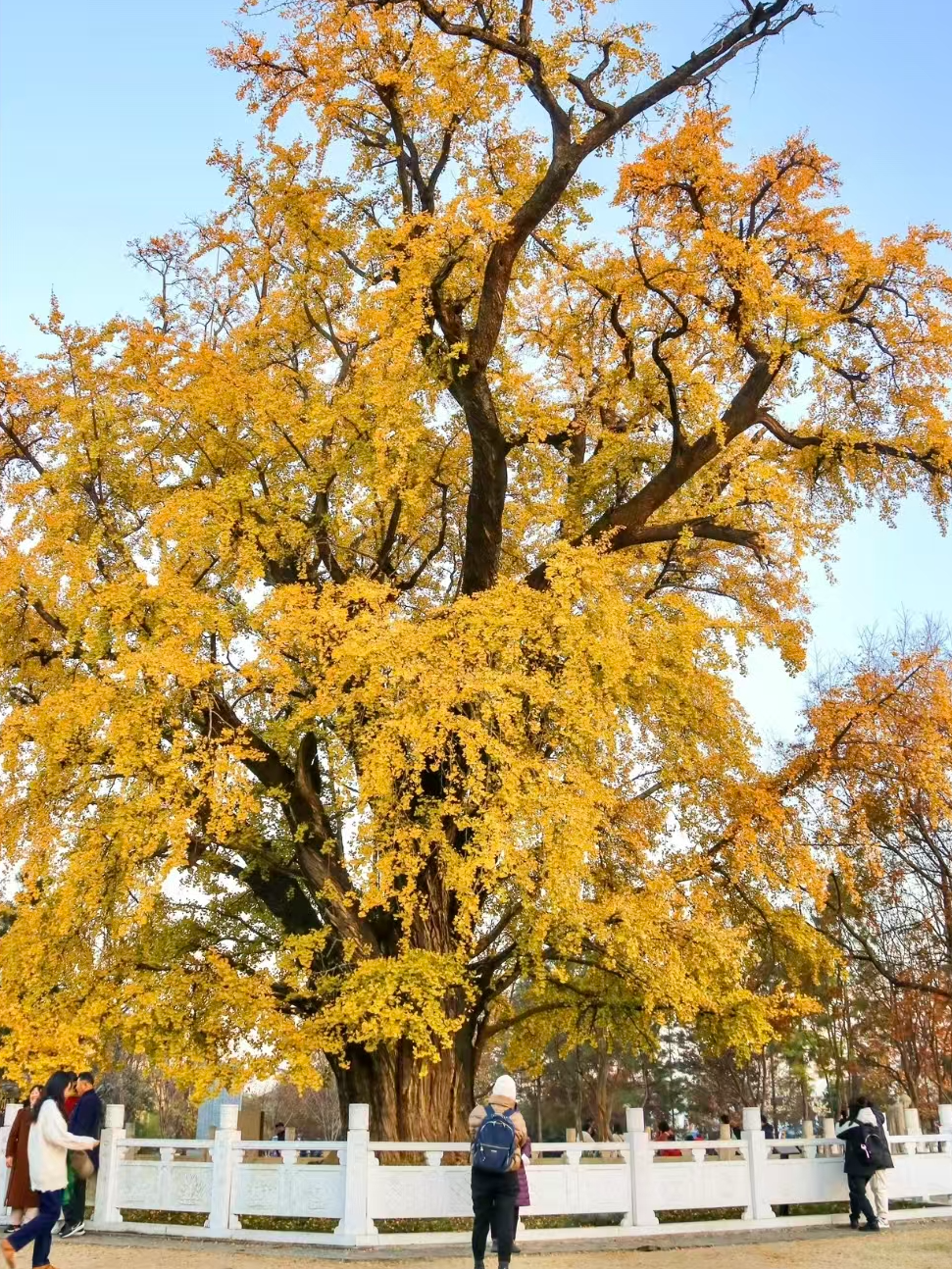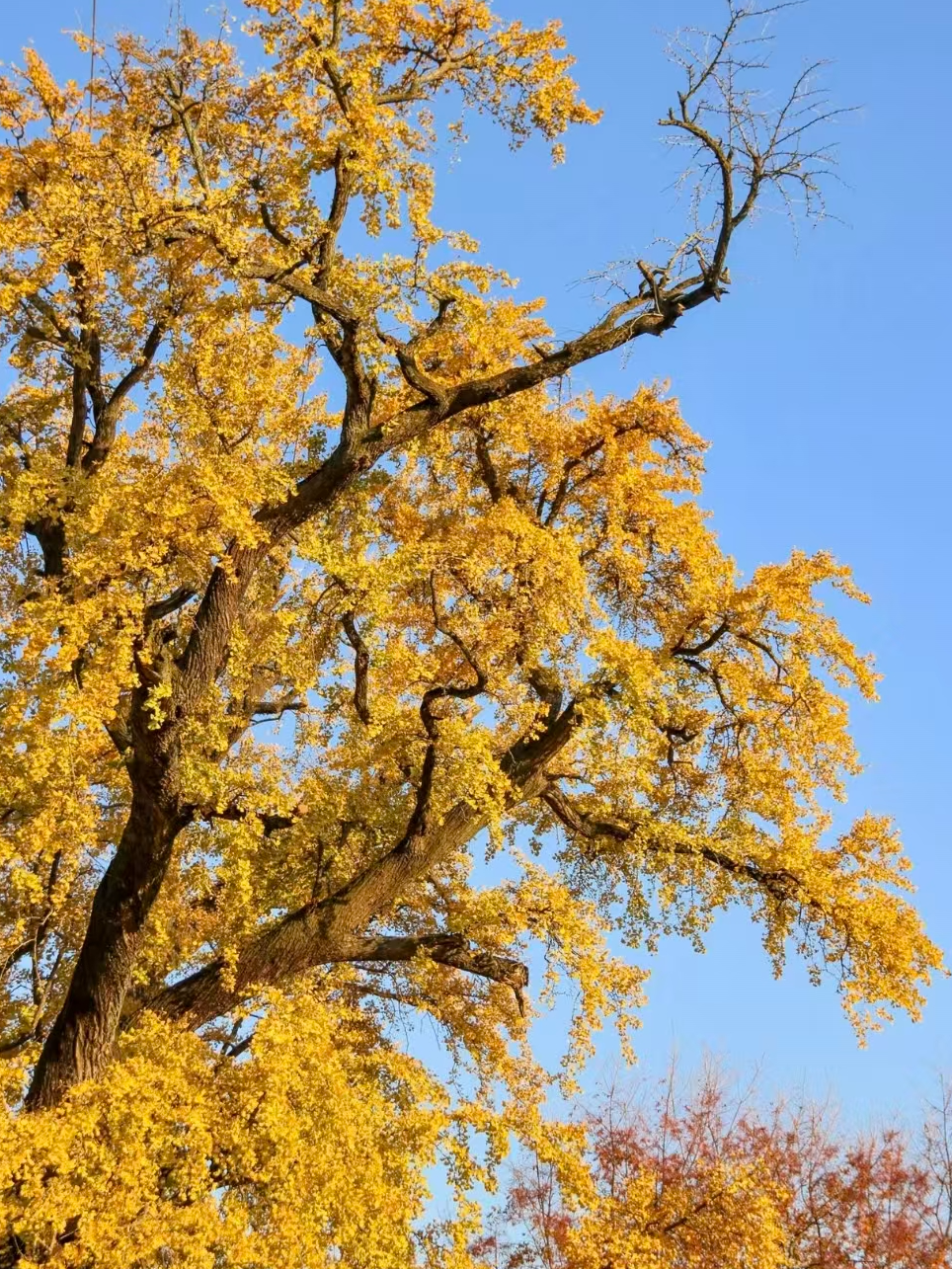 古木の下で見上げると、透き通るような黄金色のイチョウの葉が、大きな傘のように天地を覆っています。歴史の重みと歳月の洗礼が、いま目の前に実在する姿となって現れ、力強い生命力を物語ります。