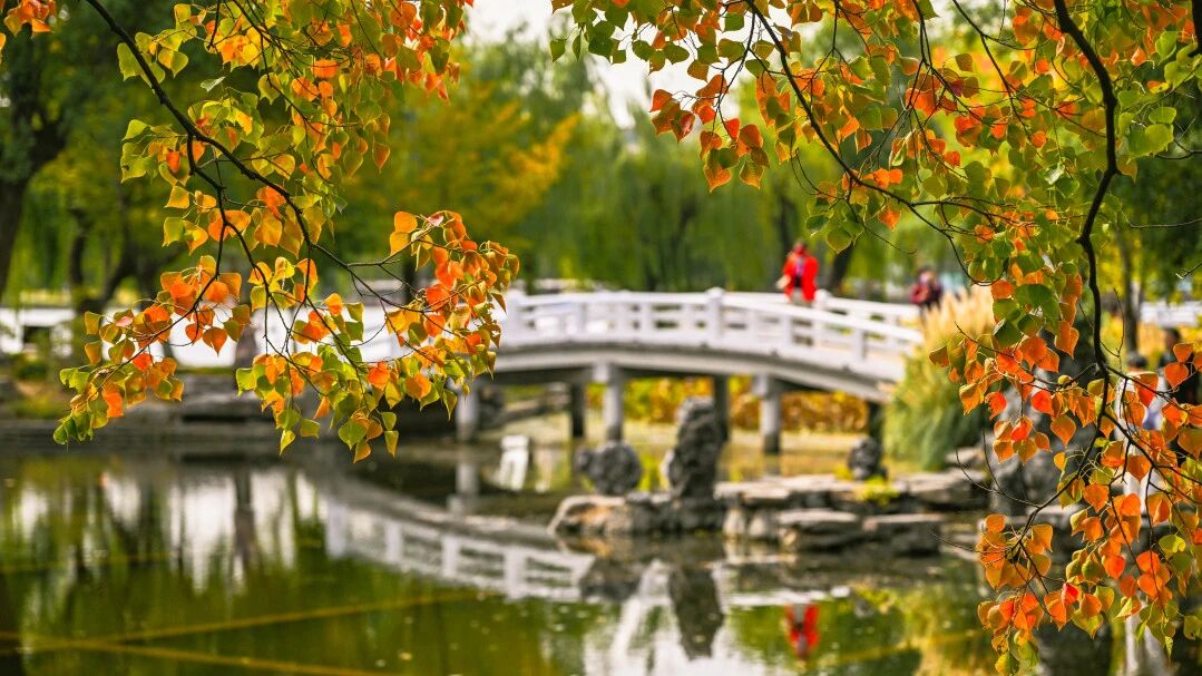 11月中旬から下旬にかけて、北区の蓮花精品園に立つ、秋の使者と称される「消息樹」と呼ばれるナンキンハゼが、園内を代表する秋の象徴的な景観となります。水辺に佇むその姿は、葉が黄金色から深紅へと染まり、陽光を浴びてひときわ鮮やかに輝きます。